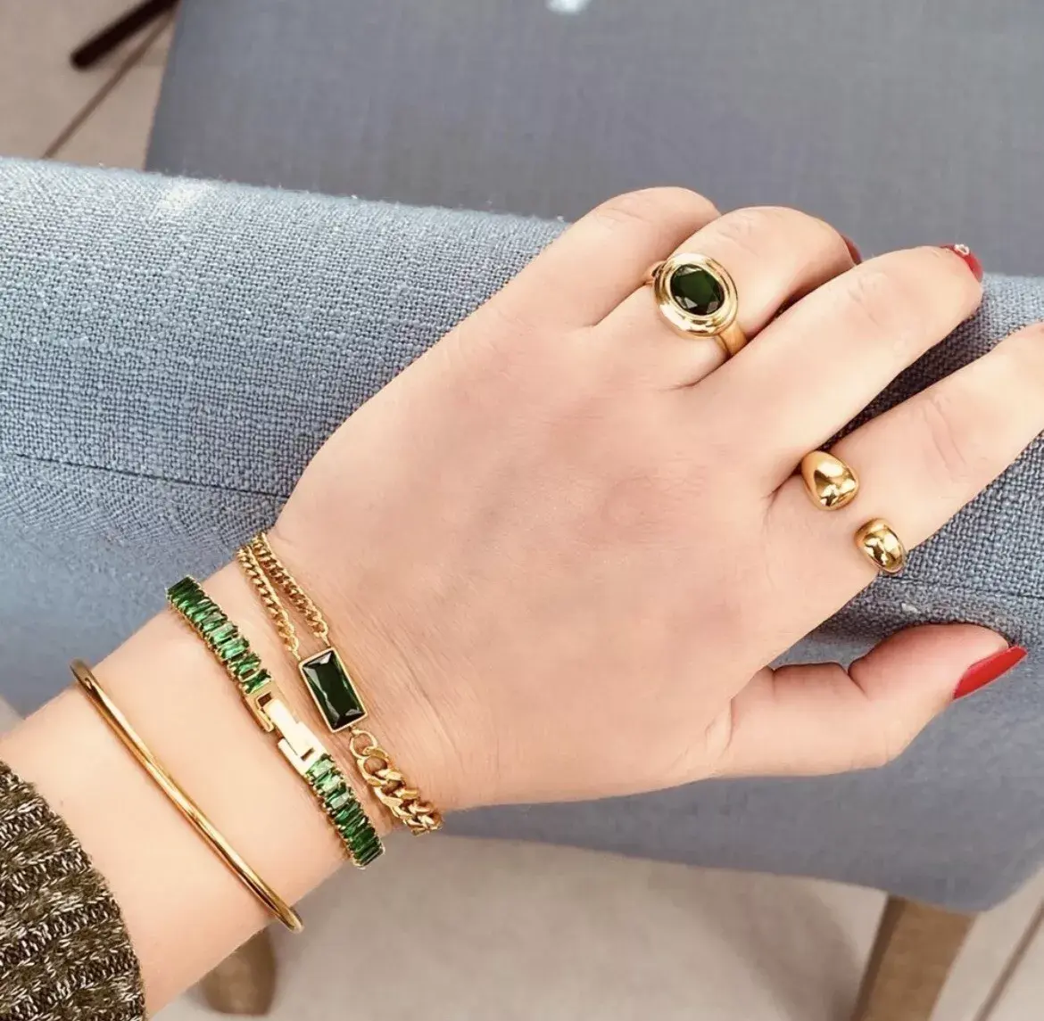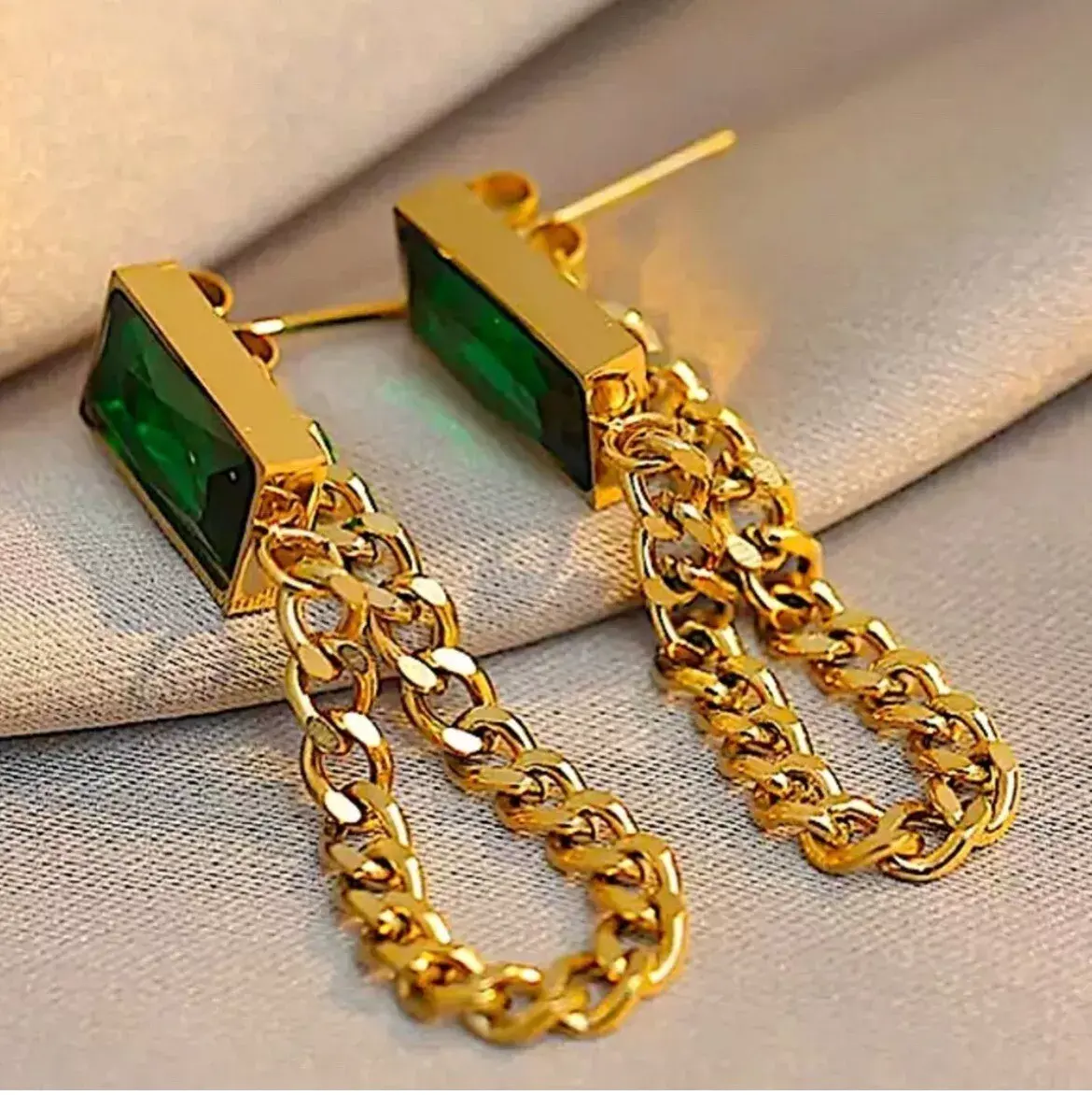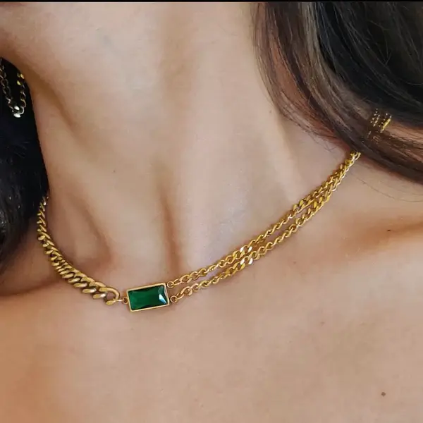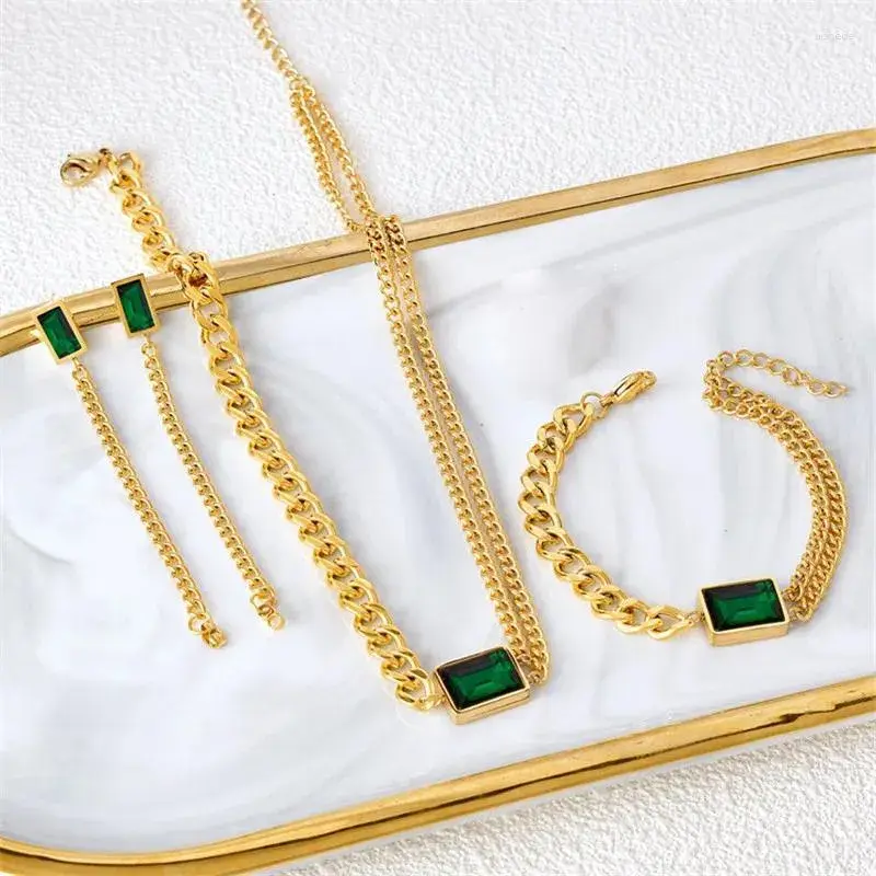 ELEVATE YOUR STYLE WITH THIS STUNNING STAINLESS STEEL EMERALD GREEN GEMSTONE COMPLETE NECKLACE SET. THIS ELEGANT SET FEATURES A CAPTIVATING EMERALD GREEN GEMSTONE PENDANT NECKLACE AND MATCHING EARRINGS. THE RICH EMERALD GREEN COLOR, COMBINED WITH THE INTRICATE DESIGN, CREATES A TRULY MESMERIZING LOOK. CRAFTED FROM HIGH-QUALITY STAINLESS STEEL, THIS SET IS HYPOALLERGENIC, DURABLE, AND PERFECT FOR ANY OCCASION.